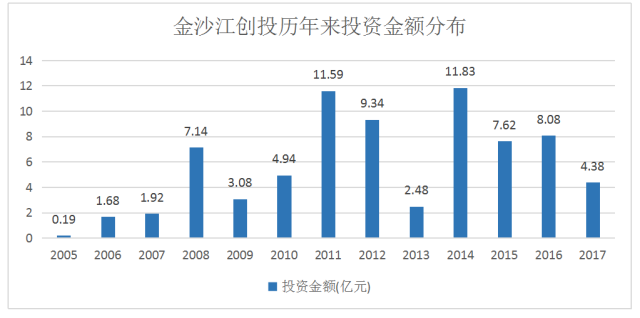 金沙江创投累计投资额约为70.48亿元,平均每年5.42亿元。金沙江创投在2011年和2014年投资额均超过了10亿,分别为11.59亿元和11.83亿元。