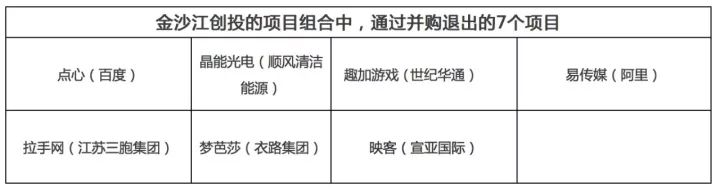 6、在金沙江创投的项目组合中,IPO退出6个项目,并购退出7个项目,股权转让退出3个项目,回购(包括MBO)退出2个项目