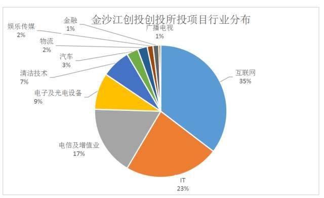 金沙江创投以互联网和IT行业作为主要投资对象,投资项目数量分别占总数的35%和23%。其他行业依次为电信及增值业、电子及光电设备、清洁技术行业等,分别占比达到17%,9%和7%;汽车、物流、娱乐传媒、金融和广播电视等行业也略有涉及。