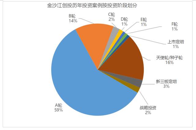 从投资阶段上来看,金沙江创投以天使轮/种子轮、A轮和B轮等早期项目投资为主,其中A轮投资占比高达59%,天使轮/种子轮占比约16%,B轮占比约14%。