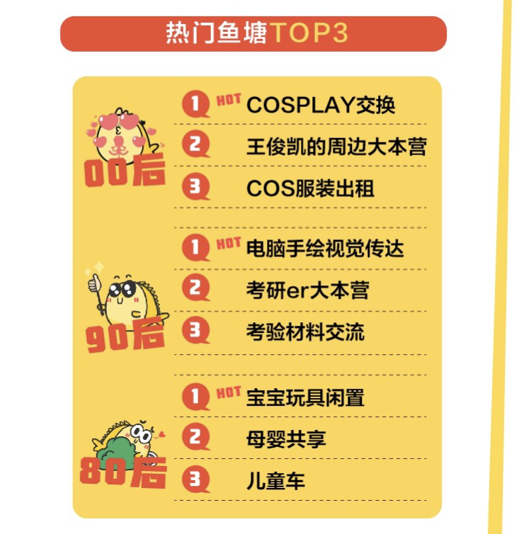 与80、90后画风迥异的是,00后关注最多的鱼塘则是“cosplay交换”、“王俊凯的周边大本营”和“cos服装出租”。没有90后的就业压力,也无需像80后一样把精力投射在育儿问题上,00后把热情都投注到了二次元和追星领域。不知道这种无忧无虑的状态,是否会让8090后心生羡慕。