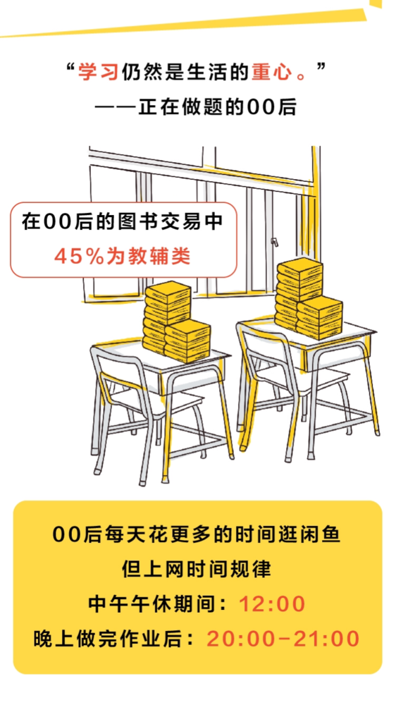 虽说00后相对前卫,但处于学龄期的他们,学习还是生活的重心。数据显示,00后在闲鱼的图书交易中,45%为教辅类。根据中国青少年研究中心发布的《“00后”发展状况研究》调查显示,超7成“00后”作业超标,他们的课外班时间是“90后”的2倍,过半“00后”睡眠不足。尽管家庭经济条件较为丰裕,00后可以享受许多8090后少年时无法享受的物质条件,但是学业压力下的生活也并没有想象中那么轻松。