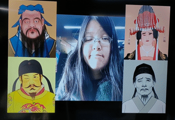 其实这是一个被投影到屏幕上的手机应用,识别你的表情动作后,就可以让屏幕上的“孔子”、“唐太宗”、“杨贵妃”、“李白”做出一样的表情和姿态。