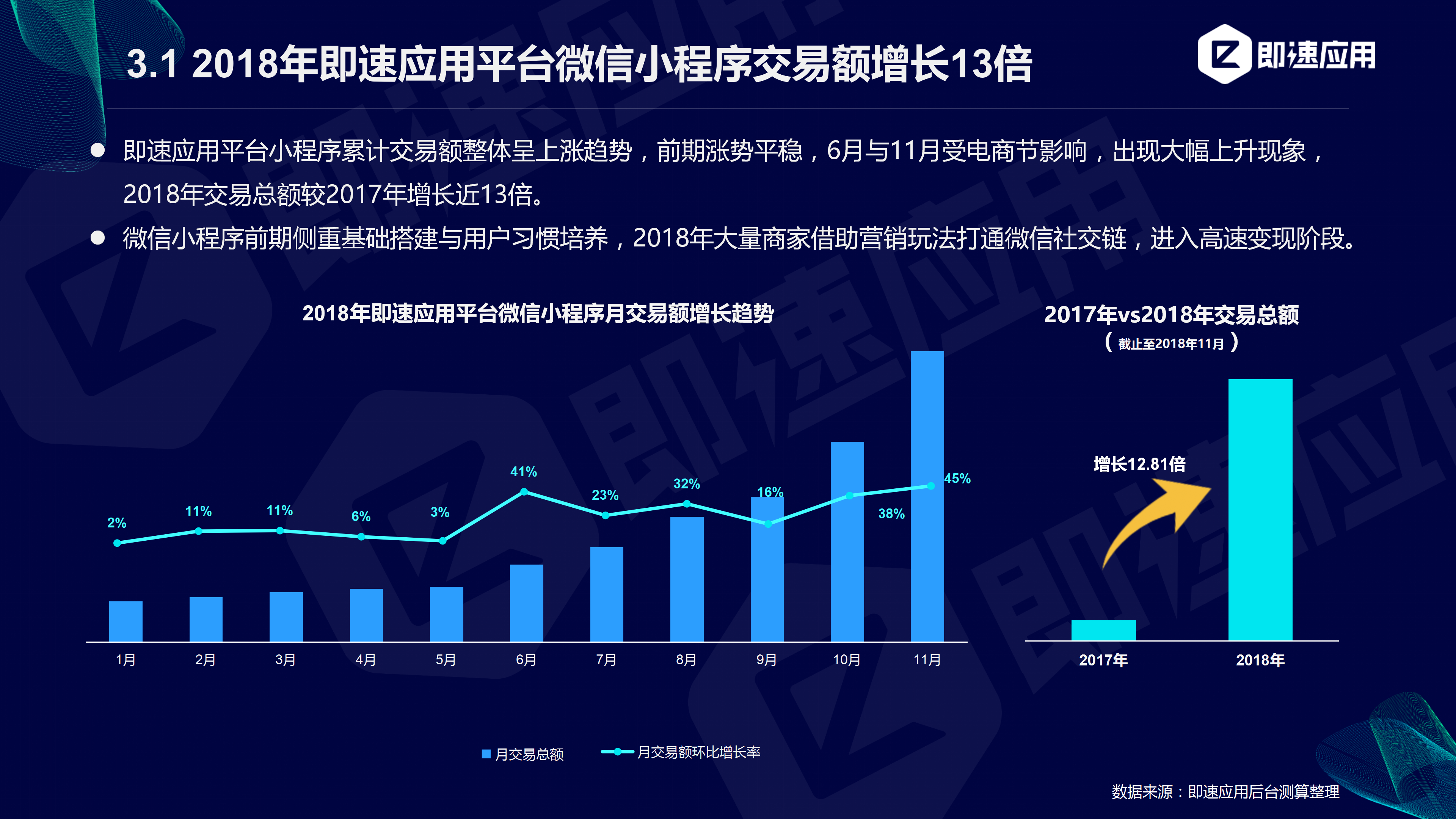 据即速应用后台数据显示,2018年平台微信小程序交易额较2017年全年增长近13倍。其中,受“618电商购物节”以及“双十一狂欢节”影响,6月与11月的小程序交易额出现明显增幅。