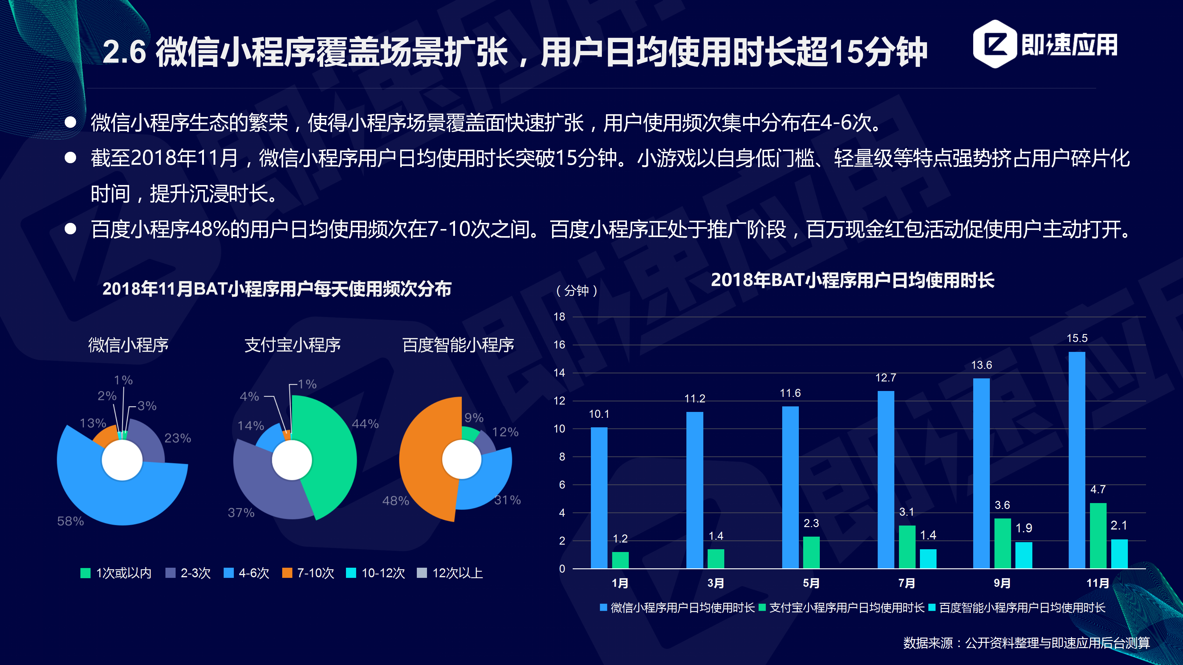 小程序的场景覆盖面边界迅速拓宽,超过半数用户的小程序使用频次在4-6次。同时受到小游戏发展的影响,用户的沉浸时长明显提升,截止11月,微信小程序的用户日均使用时长已超15分钟。