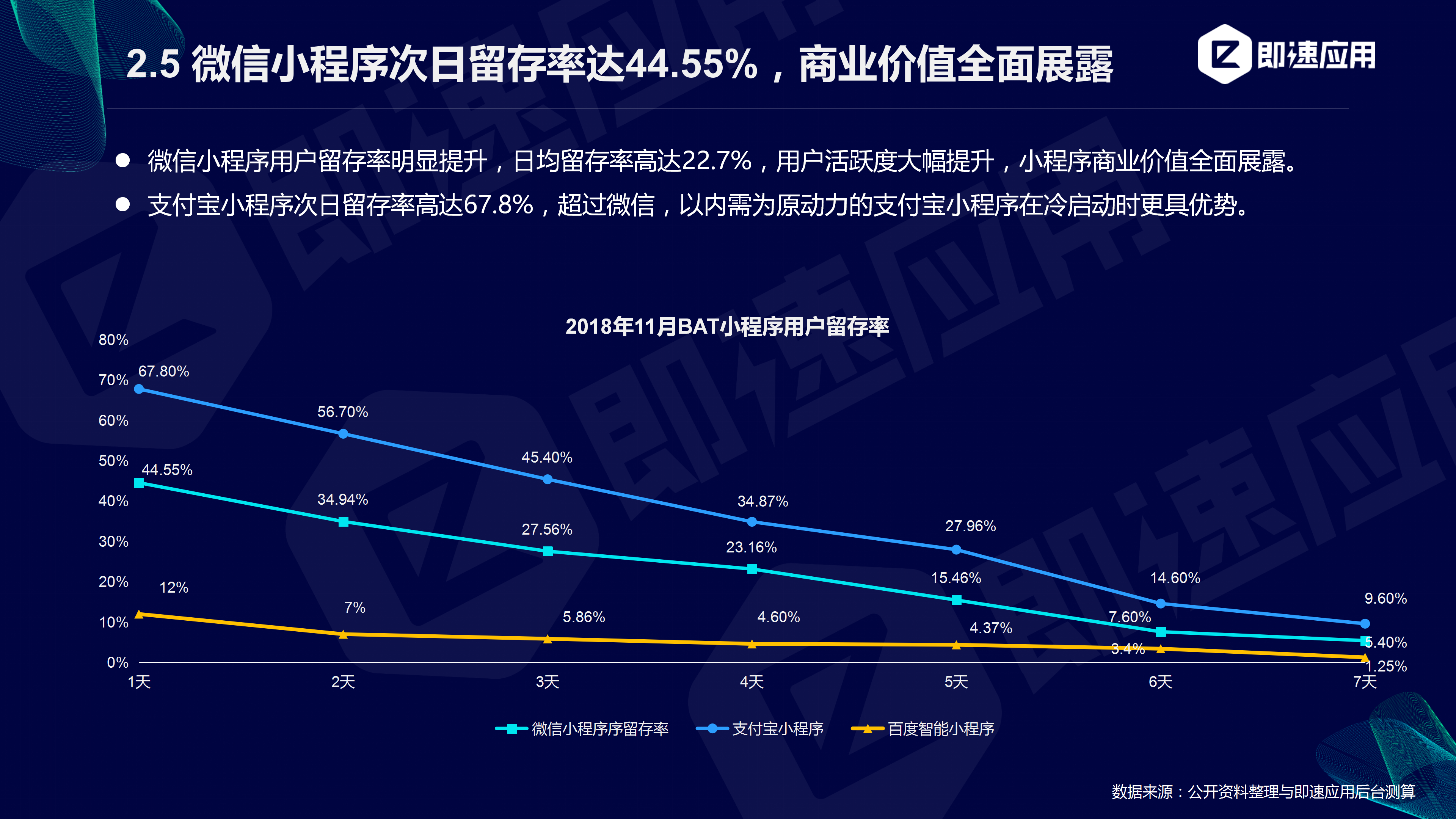 张小龙在2018年的微信公开课补充了“用完即走”的下一句,那就是“走了还会回来”,而微信小程序这一年的留存率变化无疑印证了这一点。截至11月,微信小程序的次日留存率上升至44.55%,较Q2阶段上涨3倍,日均留存率高达22.7%,用户活跃度大幅提升,小程序的商业价值全面展露。入局较晚的百度小程序在用户留存方面具有极大的想象空间。