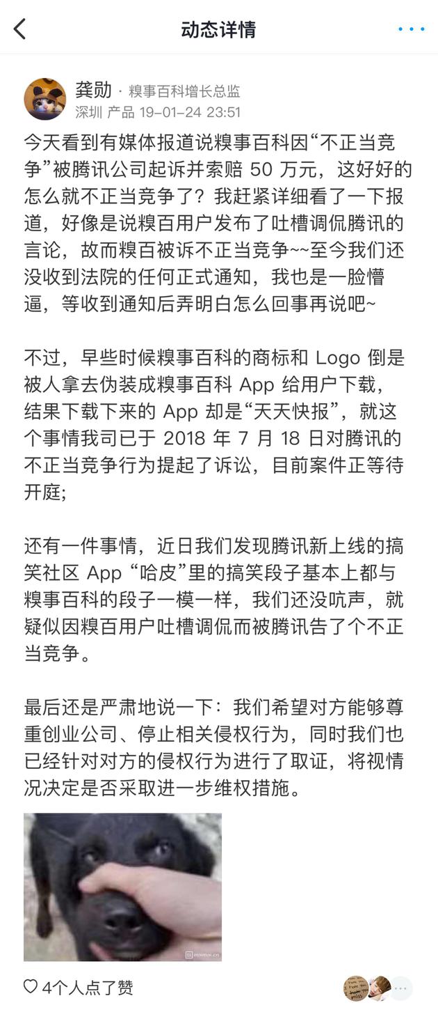 铅笔道1月25日讯,针对腾讯公司诉“糗事百科”不正当竞争,索赔50万元一事,糗事百科增长总监龚勋今天回应,至今还没收到法院的任何正式通知,等收到通知后弄明白怎么回事再说。