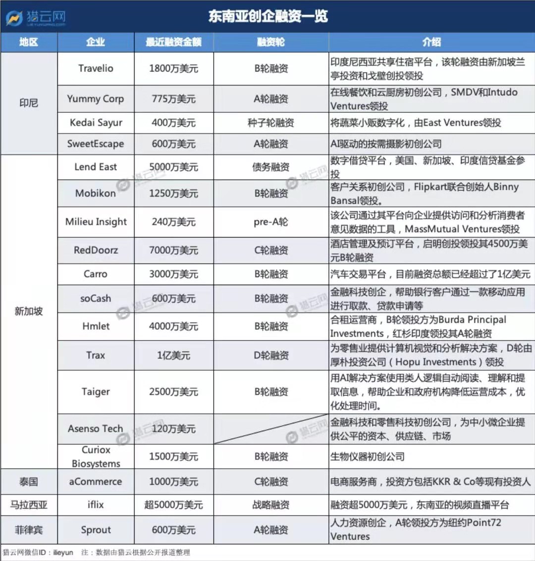 猎云网根据公开资料,整理了2019年东南亚地区的部分融资情况。