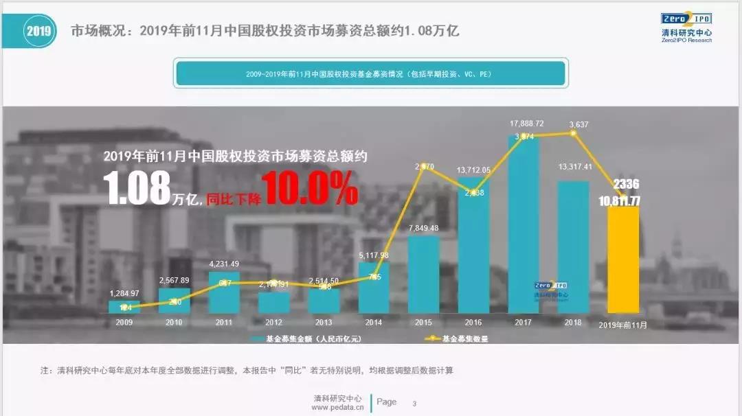 清科数据显示,2019年前11个月,中国股权投资市场募资总额是1.08万亿,虽然表面上与2018年同期相比仅下降10%,但除去国有背景的基金,民营机构募资仍然十分惨淡。