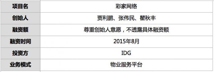 目前,平台已进驻杭州3个小区,已签约未进驻小区2个,拥有供应商17家。2015年8月,“彩家”获得 IDG 天使轮融资。